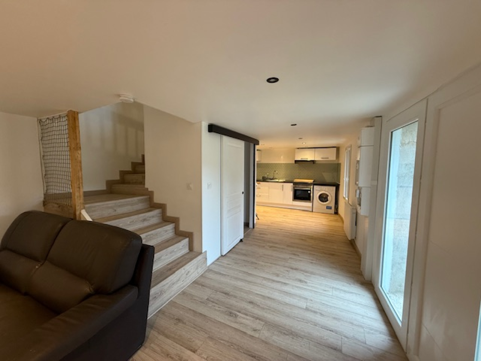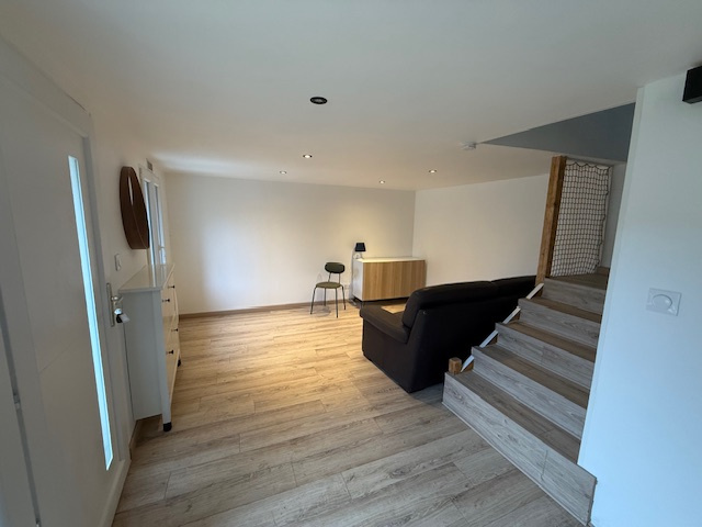 Au rez-de-chaussée : séjour, cuisine aménagée équipée, wc avec lave mains.